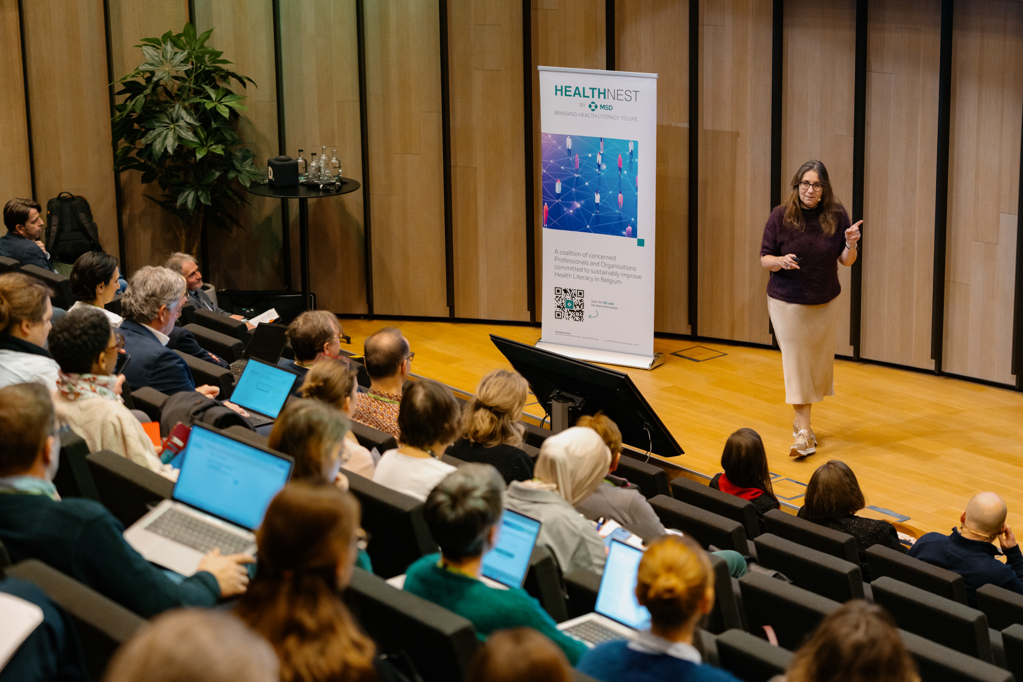 Professor Stephan Van den Broucke (UCL), voorzitter van de raad van bestuur van HealthNest, opende het evenement en gaf de aanwezigen een inzicht in de werking en de ambities van de organisatie. Hij schetste de uitdagingen, namelijk hoe de gezondheidsvaardigheden in België te versterken en hoe een blijvende impact te creëren.